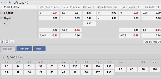 Kèo quá cân giữa hai đội ở trận này và khả năng sẽ tái hiện tỷ số hòa, như 3 lần trước đó đụng độ tại Dall Ara. Bologna bất bại 9 trận gần đây trong đó không thua 6 trận sân nhà. Napoli cũng hòa 2 trận gần nhất và đang có dấu hiệu đi xuống phong độ.