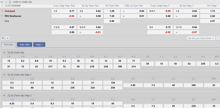 Kèo nhà cái Liverpool vs PSV hôm nay, 3h00 ngày 27/11
