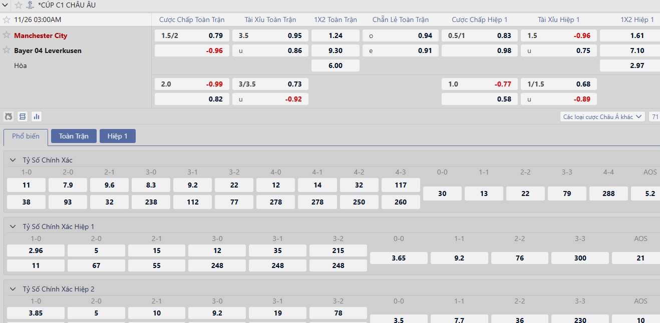 Kèo nhà cái Man City vs Leverkusen hôm nay, 3h00 ngày 26/11