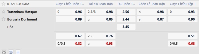 Kèo thực sự cân từ xuất phát điểm của hai đội (thắng 3 hòa 2 thua 1 ở Cúp C1). Tuy nhiên Tottenham đang tỏ ra căng thẳng hơn nhiều với 5 trận không thắng vừa qua, trong đó gần nhất là 3 trận thua. Việc Dortmund duy trì chuỗi bất bại (7 trận) cùng 3/4 chiến thắng gần đây có thể kỳ vọng.