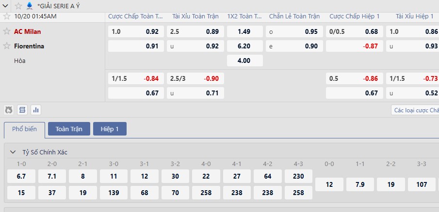 Kèo tài xỉu ở trận đấu này có tín hiệu tăng lên 2 3/4, trong bối cảnh cả hai đều sẵn sàng bùng nổ. 3/4 vòng Serie A gần đây của Fiorentina có từ 3 bàn trở lên. Milan cũng có 3/4 trận gần nhất khởi sắc bàn thắng. 7/9 cuộc gặp gỡ gần nhất đồng thời nổ Tài.
