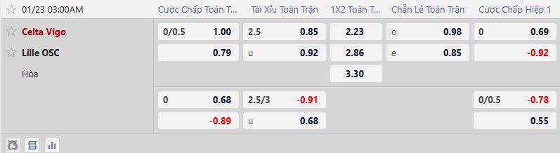 Soi kèo Celta Vigo khả quan với mức 0:0 đẩy lên -1/4, cùng việc sớm ổn định trở lại dù thua 2 trận gần nhất ở Cúp C2. Việc Lille không đảm bảo trong đó có 2 thất bại sân khách ở Cúp C2, nên hãy thận trọng.