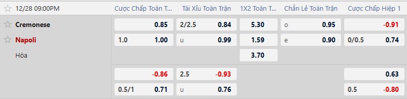 Kèo tài xỉu ở trận này giảm sâu dễ hiểu, từ 2 1/2 xuống 2 1/4. 3 trận gần nhất của Cremonese cùng 4/6 trận sân nhà vừa qua dưới mức 3 bàn. 11/13 trận gần đây của Napoli cũng đồng thời về Xỉu, những tín hiệu bàn thắng khá thấp.