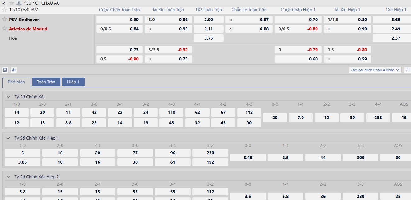 Các chuyên gia Tỷ lệ kèo đánh giá kèo chênh hợp lý giữa hai đội, với chút nhỉnh hơn cho Atletico có nhiều kinh nghiệm hơn. Tuy nhiên 2 trận thua sân khách vừa qua đang là vấn đề lớn với thầy trò HLV Diego Simeone. Trái lại, PSV bùng nổ thắng 11/14 trận gần đây (hòa 3), đủ tự tin thắng trận này.