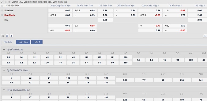 Kèo tài xỉu ở trận này liên tục tăng từ 2 1/4 tới 2 1/2 trái ngược so với tín hiệu từ lượt đi (hòa 0-0). Lần này chiến thắng sẽ là phần thưởng vé tới VCK World Cup, đặc biệt với Scotland cởi mở ở 3 trận gần nhất, bên cạnh 4 trận sân nhà nổ Tài. 6/7 trận vừa qua của Đan Mạch cũng có từ 3 bàn trở lên.