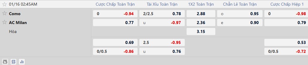 Tỷ lệ kèo Como vs AC Milan hôm nay, 2h45 ngày 16/1 (F8)
