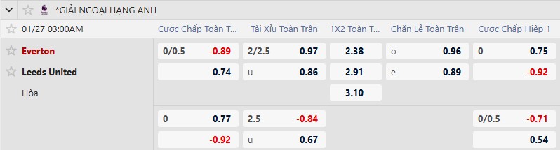 Tỷ lệ kèo Everton vs Leeds hôm nay, 3h00 ngày 27/1