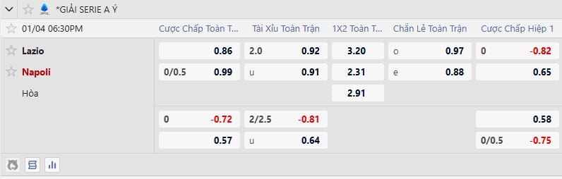 Tỷ lệ kèo Lazio vs Napoli hôm nay, 18h30 ngày 4/1