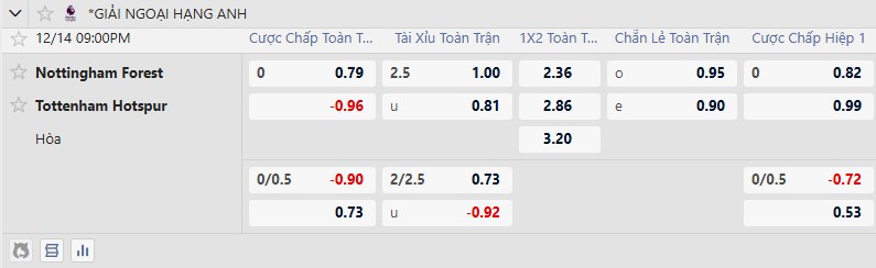 Tỷ lệ kèo Nottingham vs Tottenham hôm nay, 21h00 ngày 14/12 (F8)